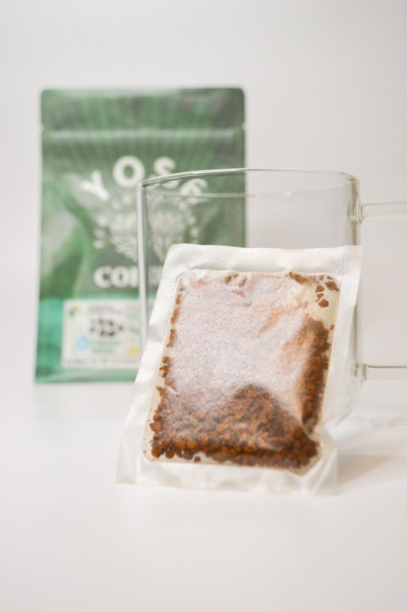 A: Individual YOSE Coffee comes packaged in a plant & fungi based film. It is fully dissolvable in hot water. There are 8 servings per bag and the main bag is fully compostable, no special equipment required. Tear it into pieces and bury it in your garden, it’ll become worm food and feed your plants in 90-180 days.